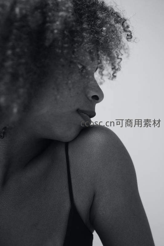 以高对比度黑白影像捕捉一位非裔女性的侧颜轮廓,蓬松卷发与柔滑肌肤形成鲜明纹理对比,流露出宁静内敛的优雅气质。