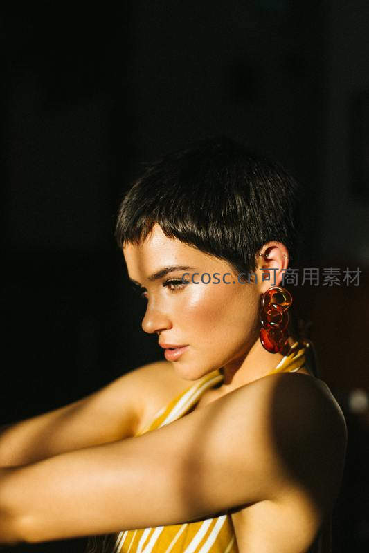 短发女子侧颜特写,光影勾勒优雅轮廓