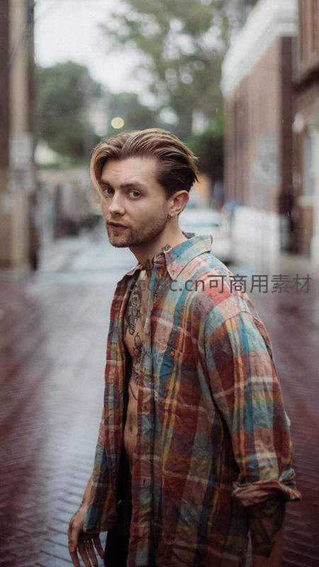 一位穿着彩色格子衬衫的年轻男子站在湿润的砖石街道上,背景是模糊的城市建筑和绿树,展现出都市生活的随性与文艺气息。