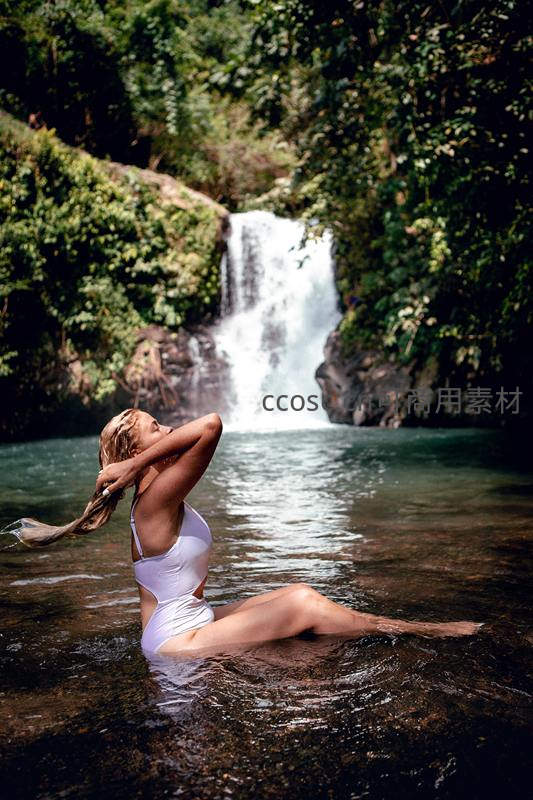 一位金发女子身穿白色泳衣坐在清澈水潭中,背后是奔腾的热带瀑布与茂密绿植,她优雅地整理着湿发,享受着自然山水间的宁静与清凉。