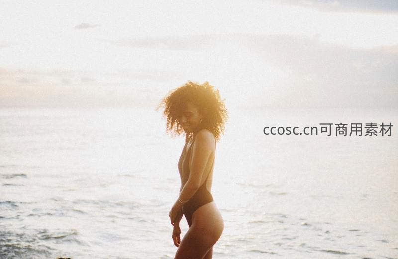 夕阳海面上漫步的卷发女子背影