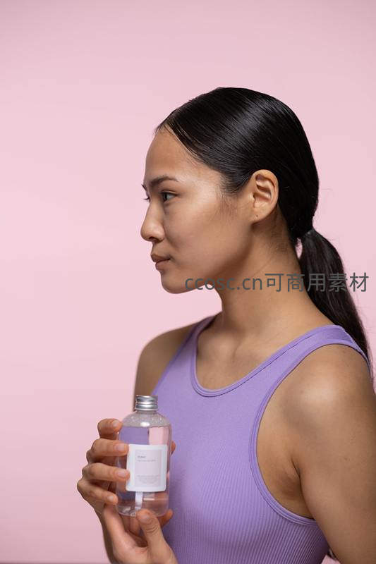 紫衣女子手持透明瓶装护肤品侧颜特写