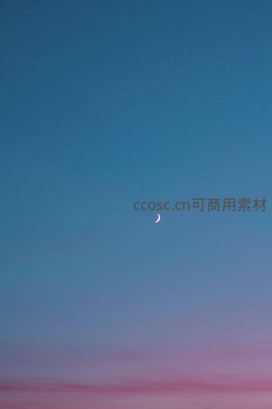 一弯新月悬于蓝粉交融的暮色天幕,云层轻柔铺展,传递出宁静温柔的夜晚气息。
