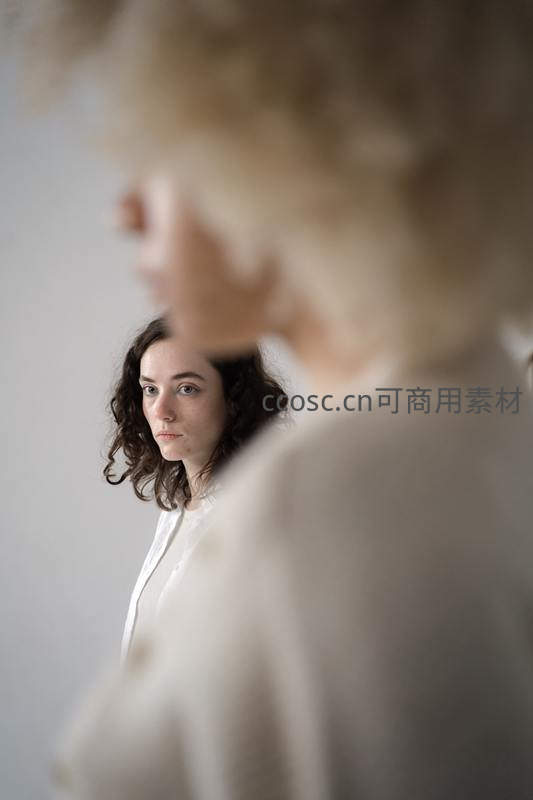 前景模糊的金发轮廓后,镜中深色卷发女子直视镜头,眼神充满故事感,营造内省与自我对话的静谧氛围。