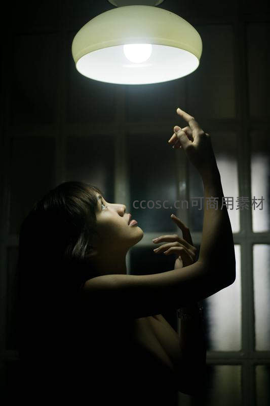 在昏暗房间中,一位女子仰头凝视头顶亮起的吊灯,伸出手指轻触光线,面部被柔和光晕勾勒,营造出静谧、梦幻且略带哲思的氛围。
