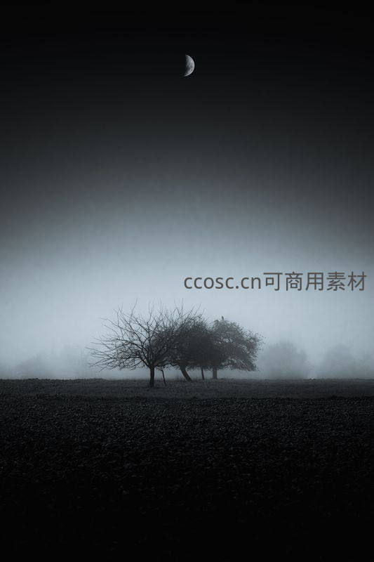 月牙高悬于浓雾笼罩的旷野之上,几株孤树静立,散发出苍凉而寂寥的自然美感。