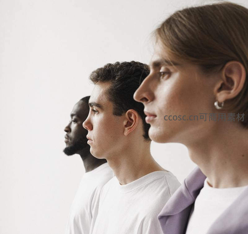 三位不同肤色的青年并排站立,均以侧脸面向同一方向,神情专注,身着简约白T恤,背景纯净,凸显了青春与多元共存的主题。