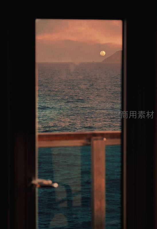 透过深色门框,一轮金黄的满月悬于海天相接处,远方山峦与海面波光粼粼,营造出静谧而富有诗意的黄昏景象。