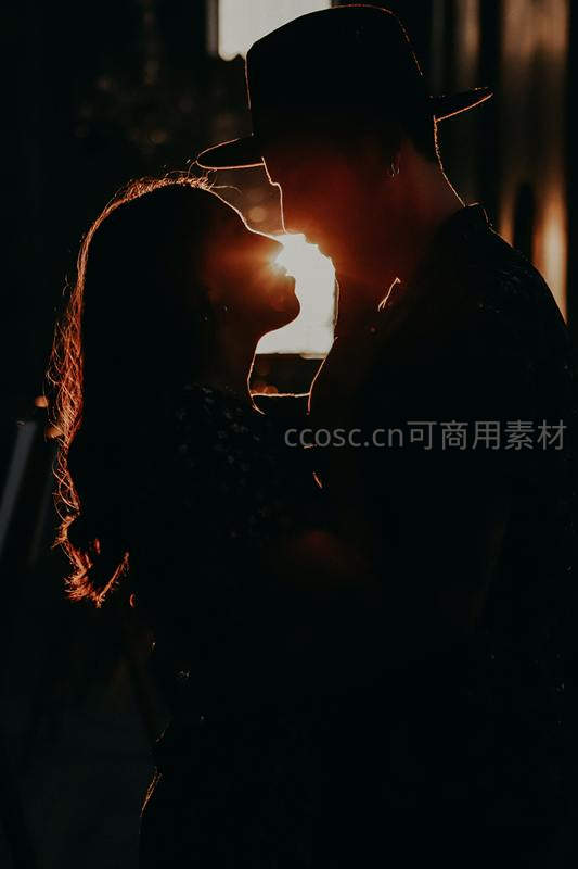 一对情侣在温暖的逆光中深情对视,轮廓被阳光勾勒成唯美剪影,背景虚化突出情感张力,营造出电影般的浪漫氛围。