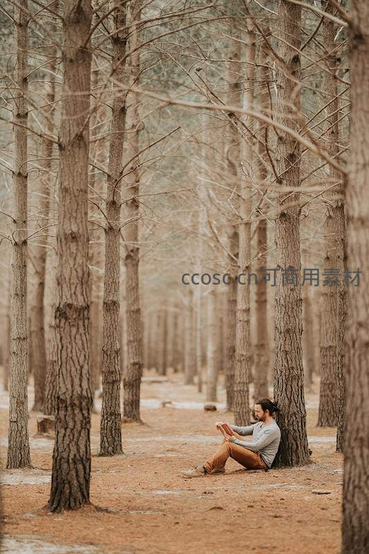 一名男子背靠松树,在寂静的林间小径上安静阅读,四周高耸的树木与落叶铺就的地面共同营造出远离尘嚣、回归自然的宁静感。