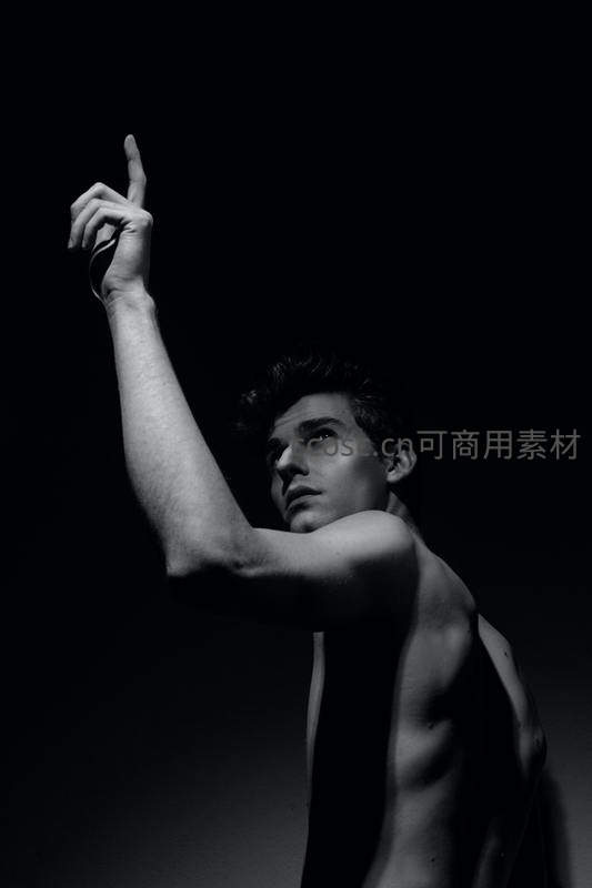 黑背景下的男性艺术肖像,手臂高举指向远方