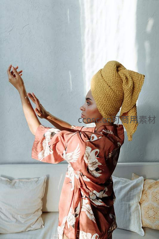 头裹毛巾女子晨光中伸展,身穿仙鹤图案睡袍