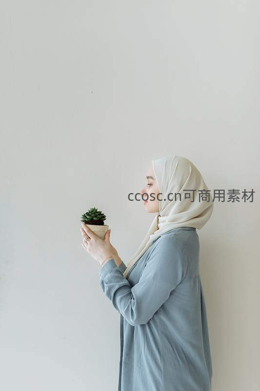 一位佩戴浅色头巾的女子侧身站立于白墙前,双手轻托一盆小巧多肉,神情专注而平和,传递出生活中的静谧与温柔。