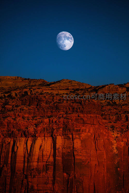 一轮皎洁的满月悬挂在深蓝色夜空,俯瞰着被月光照亮的红色砂岩峡谷,展现出大自然鬼斧神工的壮丽与神秘。