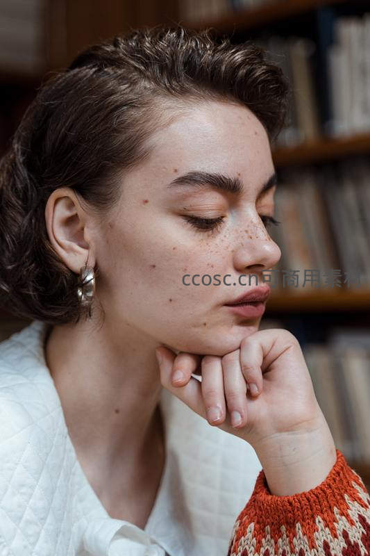 女子以手托腮,眼神微闭,沉浸在自己的思绪中,身后是满载书籍的木质书架,暖色调灯光映衬其自然雀斑与精致妆容,散发出静谧知性的魅力。