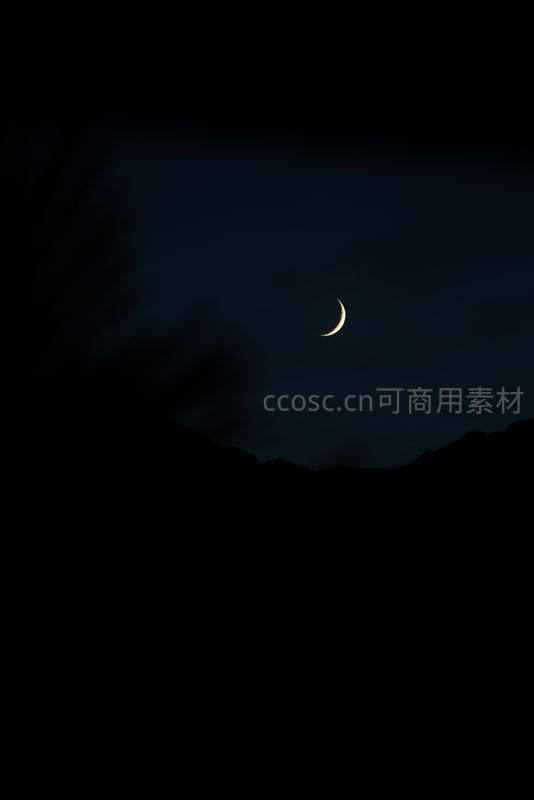 在一片深邃的墨蓝色夜空中,一弯纤细的新月如银钩般悬挂,下方是连绵山脉的黑色剪影,营造出静谧而神秘的氛围。