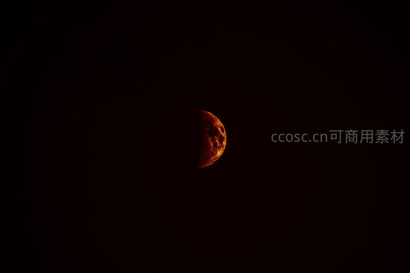 在无垠的漆黑夜幕中,一轮呈现深红色调的血月半隐半现,其表面纹理清晰可见,是罕见而壮观的月全食天文现象。