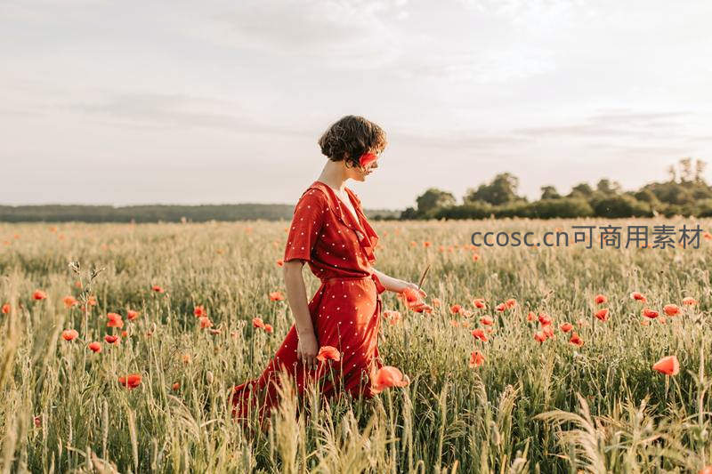 身穿红裙的女子穿行在盛放的罂粟花海中,晚霞为画面镀上暖色,展现人与自然和谐共处的浪漫田园风情。