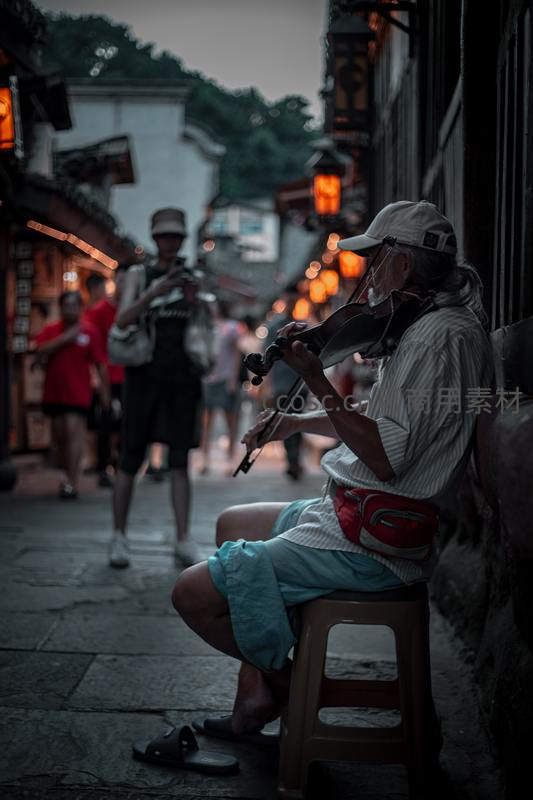 暮色降临的古镇石板街上,一位老艺人坐在小凳上专注演奏小提琴,身后灯笼微亮,行人穿梭,传统与现代交融的温暖画面。