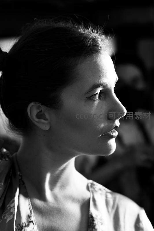 自然光从后方洒落,照亮发梢与脸颊边缘,女性侧脸在柔光中若有所思,营造出温柔且富有层次的画面。