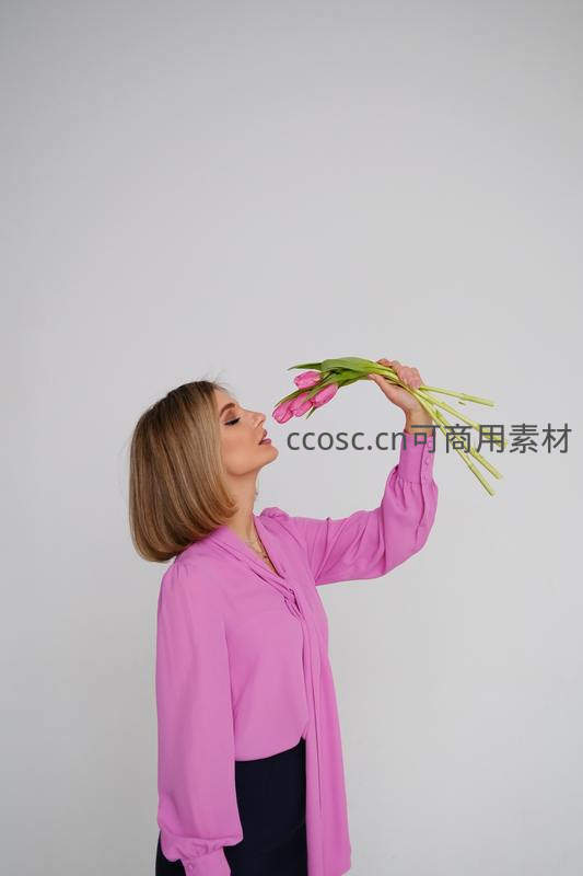 身着亮粉色上衣的女子闭目轻嗅手中粉色郁金香,姿态优雅,背景纯净,传递出春天的浪漫与生活的小确幸。