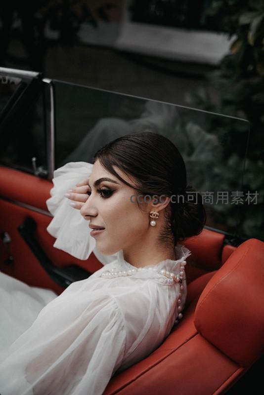 一位身着白色婚纱的新娘,佩戴珍珠饰品,优雅地倚靠在红色复古敞篷车内,背景绿植朦胧,氛围浪漫而宁静。