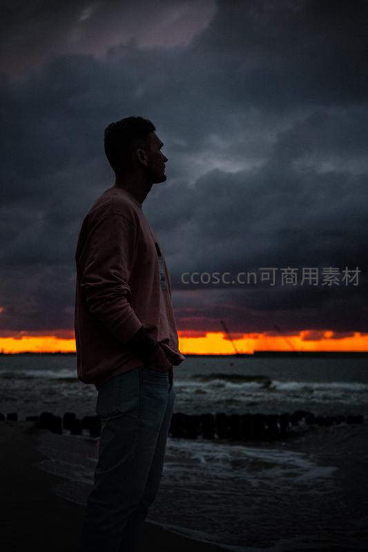 一名男子静立海岸,背对镜头,剪影映衬着橙红晚霞与厚重乌云,海浪轻拍礁石,营造出沉思与壮阔交织的意境。