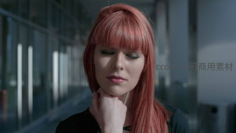 拥有鲜艳粉红色长发的女子,在现代感十足的玻璃走廊中闭目沉思,手轻触下巴,光影交错,展现静谧与时尚之美。
