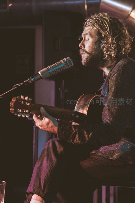 一位卷发胡须的男歌手在昏暗舞台上闭目弹唱,复古麦克风前沉浸于音乐,光影交错营造出梦幻氛围。