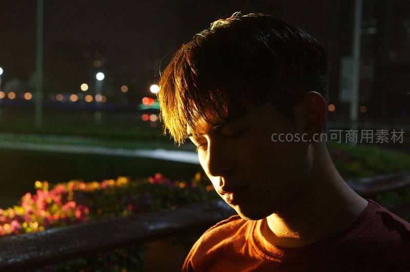 夜晚的城市街头,一位少年低头沉思,柔和的逆光勾勒出他清晰的侧脸轮廓,背景是模糊的霓虹与花丛,营造出静谧而富有故事感的氛围。