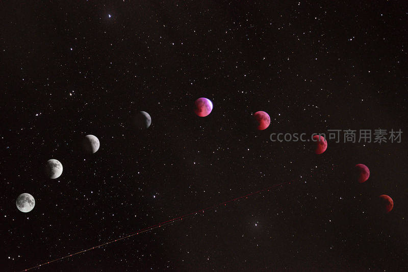 这张图片展示了月食的完整过程,从明亮的满月到深红色的血月,清晰地记录了月亮在浩瀚星空中移动的轨迹和形态变化。