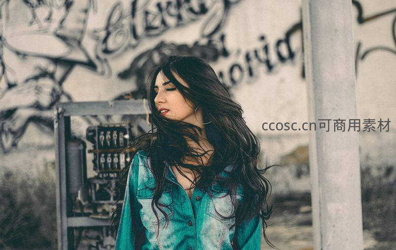 街头涂鸦背景下的长发女子侧影
