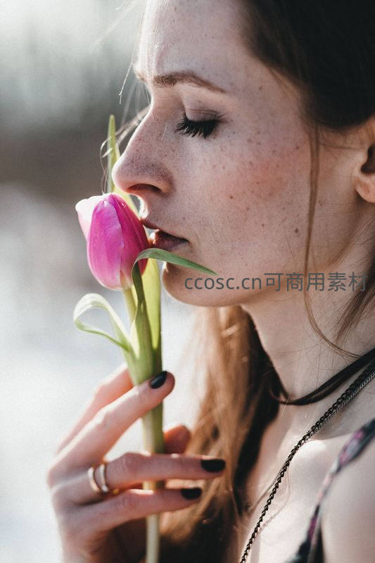 一位女性闭目轻嗅手中粉色郁金香,阳光洒在她布满雀斑的脸颊上,展现出人与自然和谐共处的温柔瞬间。