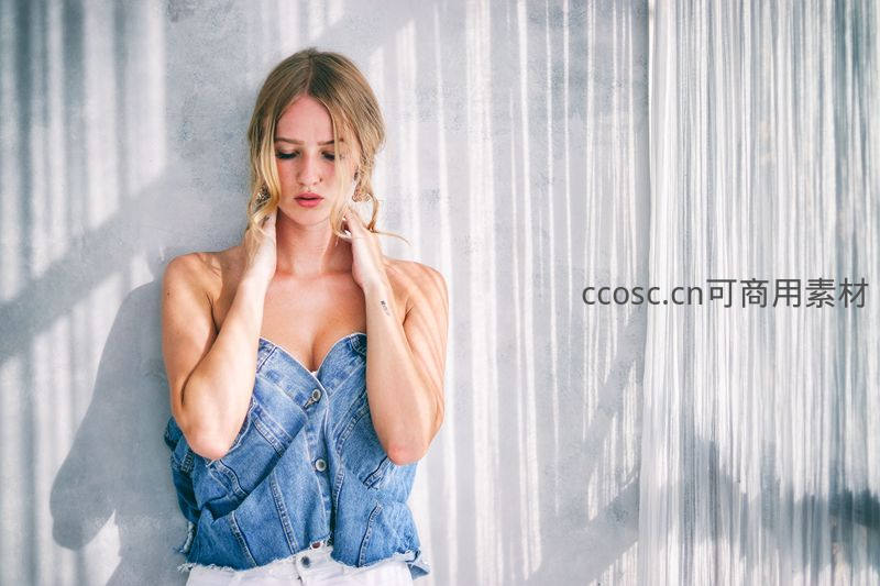 金发女子穿着牛仔背心靠在金属质感墙面,阳光投射条纹阴影,她双手轻抚颈部,眼神低垂,展现出一种慵懒又略带忧郁的青春美感。