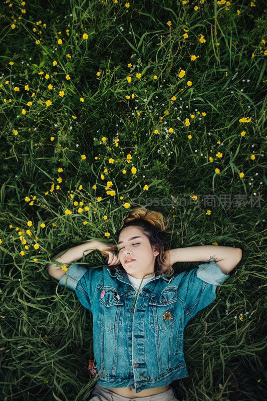 少女躺在开满黄色野花的翠绿草地上,双手枕于脑后,闭目微笑,身穿蓝色牛仔外套,画面充满自然气息与悠闲自在的生活情调。