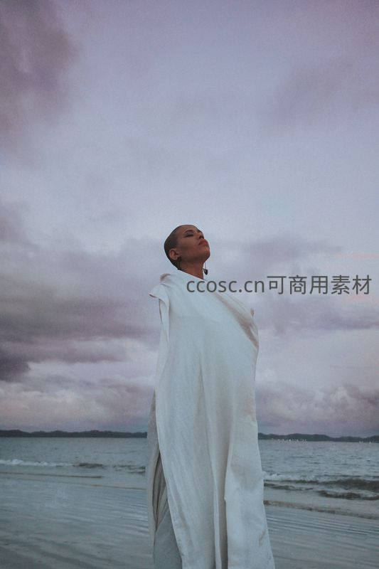 一位身披白色长袍的女子伫立在海边,仰头凝望暮色苍穹,海浪轻拍沙滩,云层渲染粉紫霞光,整体画面充满诗意与宁静的哲学意境。