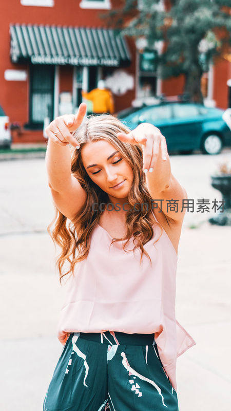 金发女子在城市街道上俏皮地比出心形手势,身穿粉色上衣和印花阔腿裤,背景是红砖店铺与绿树,洋溢着青春活力与都市生活的轻松愉悦。