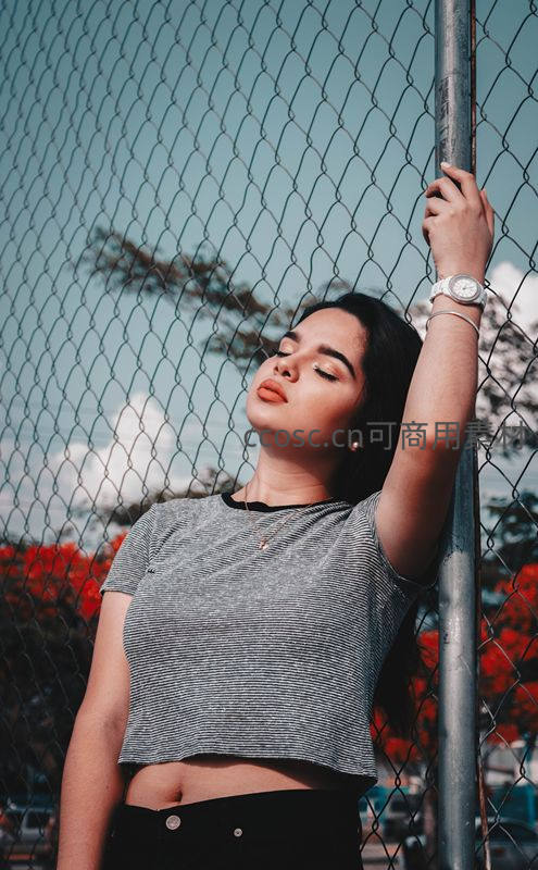 一位年轻女子倚靠在铁丝网旁,闭目享受阳光,条纹短袖与黑色长裤展现简约时尚,背景红花蓝天构成惬意的街头风景。