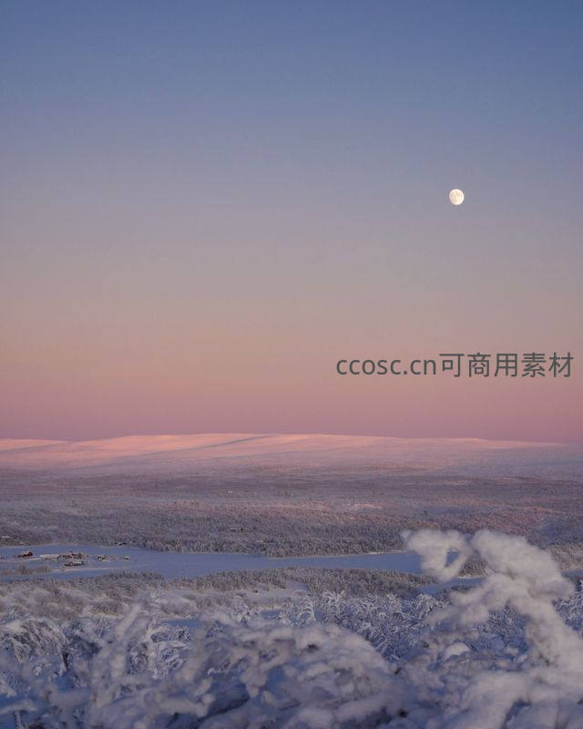 一轮皎洁的满月从粉紫色的天际线上升起,俯瞰着被白雪覆盖的无垠大地和挂满霜花的树枝,营造出极致的宁静与苍茫感。