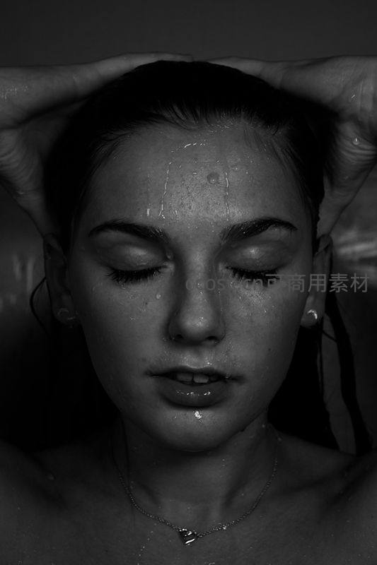 一位年轻女性在黑白光影中闭目享受水珠滑落脸庞的瞬间,神情宁静安详,湿发贴于额头,颈间细链轻垂,充满艺术感与情绪张力。