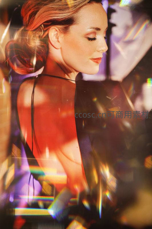 一位女性在梦幻般的光斑与色彩中展现优雅侧颜,光影流动营造出迷离而高级的艺术感。