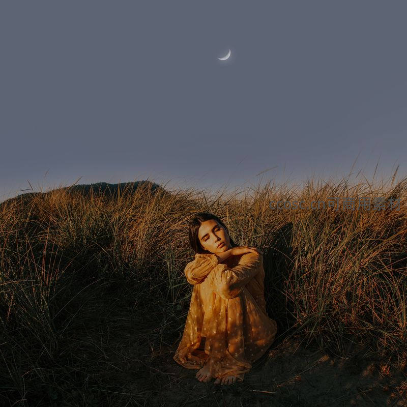 女子身着暖色长裙静坐于暮色草丛中,新月高悬天际,画面充满诗意与自然的宁静气息。