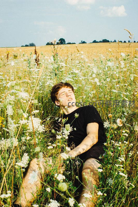 青年男子躺卧在开满小白花的田野里,闭目享受阳光,黑色T恤与金黄草地形成对比,传递出自由惬意的田园生活气息。