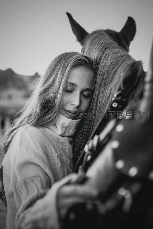 女孩温柔地将头靠在马颈上,闭目微笑,黑白画面强化了人与动物间的情感联结,背景山峦勾勒出宁静的西部风情。