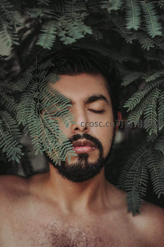 一位蓄着浓密胡须的男子闭目安卧,翠绿细叶轻柔覆盖其面庞,营造出人与自然交融的静谧氛围,充满诗意与禅意。