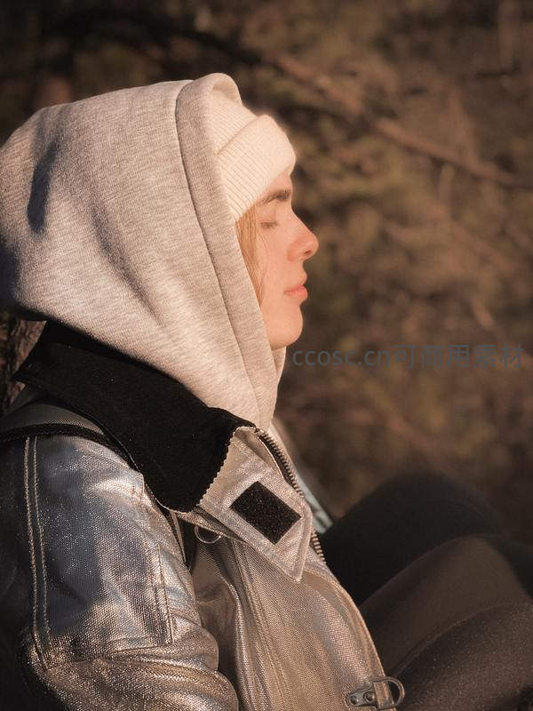 一位少女在温暖的阳光下闭目养神,身穿连帽卫衣和银色外套,背景是模糊的自然景物,整体画面散发着悠闲、惬意的青春气息。