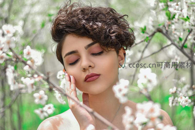一位卷发女子在盛开的白色花丛中闭目养神,手轻抚脸颊,神情安详,背景虚化突出主体,营造出诗意唯美的氛围。