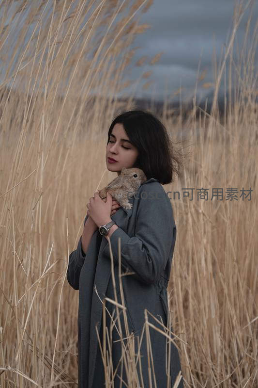 女子身着灰袍立于高耸芦苇丛中,怀抱着一只温顺的小兔,眼神柔和,背景天空阴郁,凸显人与自然的和谐静谧。