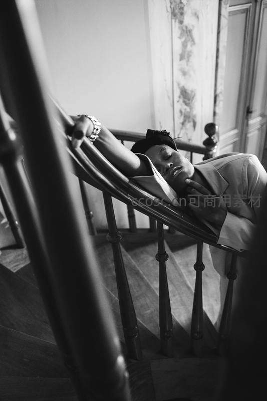 一位女士慵懒地倚靠在古典木质楼梯扶手上,黑白影像突显其优雅姿态与沉静神情,背景墙纸花纹增添复古艺术气息。