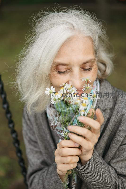 一位满头银发的老年女性,双手轻捧一束洁白雏菊凑近鼻尖,闭目沉浸于花香之中,展现出岁月沉淀下的温柔与宁静。